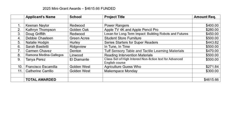 Mini-grants fund project requests up to $500, and proposals should reflect creative, innovative educational projects. Proposals are accepted from VUSD employees representing all grade levels (preschool through adult education). Funds can be used to purchase items such as materials, supplies, and equipment necessary for the completion of these projects. Applicants must demonstrate the ability to complete projects within the current school year. Proposals requesting funds to pay for field trips or items given directly to students will not be considered. Grant applications are due in October of each school year.