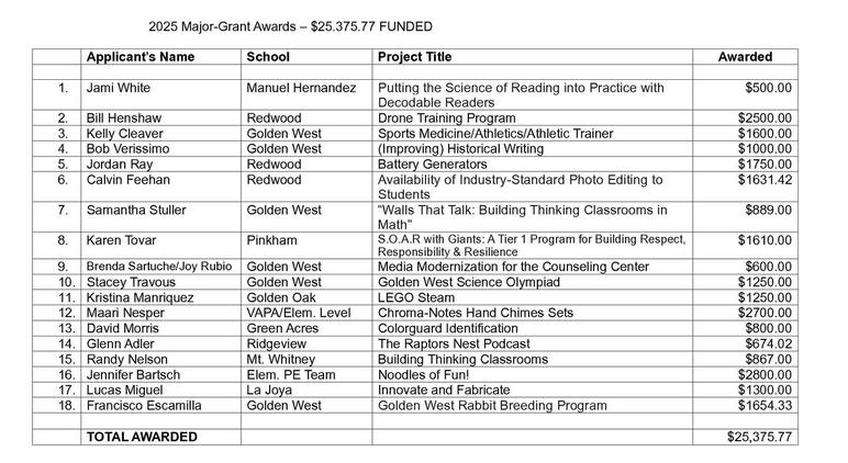 The Visalia Education Foundation (VEF) has awarded thousands of dollars to Visalia Unified teachers and staff for creative and innovative projects related to music and the arts and/or that support the standards-based curriculum. The total amount of the grants varies each year depending on the number and quality of the applications and the funding available.